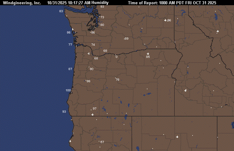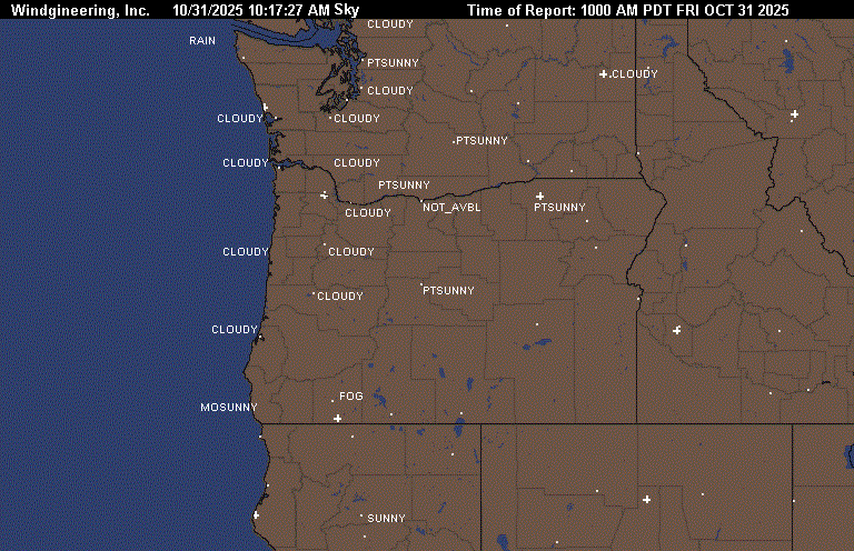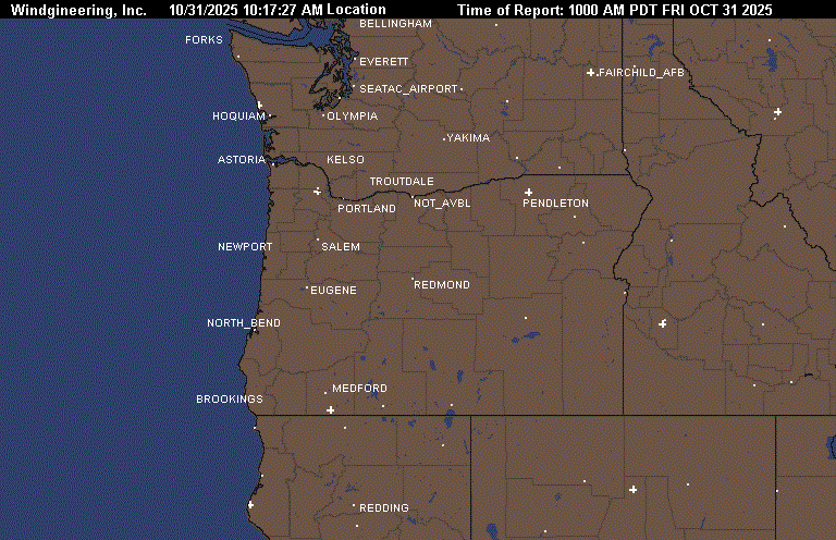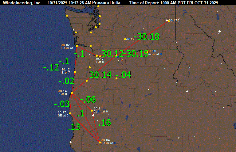 10/30/2025 6:42:49 PM10/31/2025 5:49:32 AMMinutes since image created 666OCT 31 2025 500 AM PDTGetWind(SE3)GetWind(E6)GetWind(S5)GetWind(CALM)GetWind(CALM)GetWind(CALM)GetWind(E18)GetWind(E21G31)GetWind(0)GetWind(SE6)Image can only be created once every 10 minutes. Data updated each hour ASTORIA_Pressure 30.05ASTORIA_Wind SE at 3NEWPORT_Pressure 30.11NEWPORT_Wind E at 6NORTH_BEND_Pressure 30.13NORTH_BEND_Wind S at 5BROOKINGS_Pressure 30.13BROOKINGS_Wind Calm at 0MEDFORD_Pressure 30.13MEDFORD_Wind Calm at 5REDDING_Pressure 29.99REDDING_Wind Calm at 0PORTLAND_Pressure 30.1PORTLAND_Wind E at 18TROUTDALE_Pressure 30.11TROUTDALE_Wind E at 21 with gusts to 31THE_DALLES_Pressure 0THE_DALLES_Wind at 0PENDLETON_Pressure 30.21PENDLETON_Wind SE at 6YAKIMA_Pressure 30.22FAIRCHILD_AFB_Pressure 30.19SPOKANE_GEIGER_Pressure 30.21SPOKANE_AVERAGE_Pressure 30.2ASTORIA_Pressure - NEWPORT_Pressure -.06NEWPORT_Pressure - NORTH_BEND_Pressure -.02NORTH_BEND_Pressure - BROOKINGS_Pressure NORTH_BEND_Pressure - MEDFORD_Pressure NORTH_BEND_Pressure - REDDING_Pressure .14ASTORIA_Pressure - PORTLAND_Pressure -.05PORTLAND_Pressure - THE_DALLES_Pressure 30.1THE_DALLES_Pressure - PENDLETON_Pressure -30.21NORTH_BEND_Pressure - SPOKANE_AVERAGE_Pressure -.07NORTH_BEND_Pressure - THE_DALLES_Pressure 30.13THE_DALLES_Pressure - SPOKANE_AVERAGE_Pressure -30.20:ASTORIA CLOUDY 44 42 93 SE3 30.05F 1:NEWPORT MOCLDY 45 45 100 E6 30.11F 2:PORTLAND CLOUDY 52 40 63 E18 30.10F 3:VANCOUVER_WA MOCLDY 52 42 69 E12 30.12F 4:SCAPPOOSE MOCLDY 40 38 93 NW3 30.10S 5:HILLSBORO MOCLDY 39 38 96 CALM 30.11S 6:AURORA MOCLDY 40 40 100 CALM 30.12F 7:MCMINNVILLE MOCLDY 38 37 97 CALM 30.12R 8:SALEM MOCLDY 40 39 97 NW3 30.11S FOG 9:CORVALLIS FOG 36 35 96 CALM 30.13S VSB 1/4 10:EUGENE CLOUDY 45 44 97 SE8 30.12S 11:NORTH_BEND MOCLDY 48 48 100 S5 30.13F 12:BROOKINGS CLOUDY 52 51 97 CALM 30.13R 13:ROSEBURG FOG 46 46 100 CALM 30.13R VSB 1/2 14:SEXTON_SUMMIT PTCLDY 47 42 83 S7 30.12R 15:MEDFORD FOG 44 44 100 CALM 30.13S VSB 1/4 16:TROUTDALE MOCLDY 51 40 65 E21G31 30.11F 17:REDMOND PTCLDY 22 22 100 S5 30.18S 18:BEND PTCLDY 25 23 93 CALM 30.17S 19:KLAMATH_FALLS FOG 27 26 96 CALM 30.16S VSB 1/4 20:LAKEVIEW CLEAR 26 24 92 N3 30.18S 21:HERMISTON NOT_AVBL 0 0 0 0 000000 22:PENDLETON PTCLDY 33 31 92 SE6 30.21R 23:MEACHAM NOT_AVBL 0 0 0 0 000000 24:LA_GRANDE FOG 25 25 100 CALM 30.22R VSB 3/4 25:BAKER_CITY CLEAR 21 20 96 W3 30.21R FOG 26:BURNS CLEAR 24 22 91 CALM 30.20R 27:ROME 00 28 26 92 SW6 30.17R 28:ONTARIO CLEAR 28 25 88 CALM 30.23R 29:VANCOUVER BC CLOUDY 45 43 93 E12 30.01F 30:REDDING CLEAR 48 46 93 CALM 29.99S 31:EVERETT CLOUDY 48 38 68 S7 30.05F TC 9 32:BOEING_FIELD CLOUDY 43 41 93 SE6 30.07F TC 6 33:RENTON CLOUDY 41 40 96 SE6 30.07F TC 5 34:SEATAC_AIRPORT CLOUDY 44 44 100 S3 30.07F TC 7 35:JBLM_MCCHORD CLOUDY 38 37 96 CALM 30.06F TC 4 36:PUYALLUP CLOUDY 39 39 100 CALM 30.07S TC 4 37:JBLM_FT_LEWIS CLOUDY 38 36 94 SE5 30.04F TC 3 38:TACOMA_NARROWS CLOUDY 44 43 96 S3 30.06F TC 7 39:BELLINGHAM MOCLDY 38 37 97 CALM 30.01F TC 3 40:FRIDAY_HARBOR MOCLDY 46 45 96 SE5 30.02F TC 8 41:EASTSOUND MOCLDY 48 45 87 CALM 30.01F TC 9 42:PORT_ANGELES MOCLDY 41 41 100 CALM 29.99F TC 5 43:NAS_WHIDBEY MOCLDY 46 39 76 E7 30.03F TC 8 44:BURLINGTON PTCLDY 46 46 100 CALM 30.04S TC 8 45:SHELTON CLOUDY 39 39 100 CALM 30.03F FOG TC 4 46:OLYMPIA CLOUDY 37 37 100 SE3 30.07F TC 3 47:CHEHALIS MOCLDY 39 39 100 CALM 30.07F TC 4 48:KELSO MOCLDY 39 39 100 CALM 30.10F FOG TC 4 49:VANCOUVER MOCLDY 52 42 69 E12 30.12F TC 11 50:SCAPPOOSE_OR MOCLDY 40 38 93 NW3 30.10S TC 4 51:PORTLAND_OR CLOUDY 52 40 63 E18 30.10F TC 11 52:FORKS NOT_AVBL 0 0 0 0 000000 53:HOQUIAM CLOUDY 44 42 93 E8 30.05S TC 7 54:ASTORIA_OR CLOUDY 44 42 93 SE3 30.05F TC 7 55:STAMPEDE_PASS CLOUDY 33 33 100 CALM 30.12F FOG TC 1 56:TROUTDALE_OR MOCLDY 51 40 65 E21G31 30.11F TC 11 57:THE_DALLES_OR NOT_AVBL 0 0 0 0 000000 58:OMAK MOCLDY 30 29 96 CALM 30.22F TC -1 59:WENATCHEE CLOUDY 35 34 96 CALM 30.21F TC 2 60:ELLENSBURG MOCLDY 32 30 92 CALM 30.20F TC 0 61:YAKIMA MOCLDY 33 31 92 W5 30.22F TC 1 62:EPHRATA MOCLDY 34 33 96 NW5 30.21F TC 1 63:MOSES_LAKE MOCLDY 32 30 92 N5 30.21F FOG TC 0 64:PASCO PTCLDY 33 33 100 E3 30.25S TC 1 65:HERMISTON_OR NOT_AVBL 0 0 0 0 000000 66:SPOKANE_GEIGER FOG 31 31 100 NE3 30.21S VSB 1/4 TC -1 67:SPOKANE_FELTS FOG 32 31 96 CALM 30.24R VSB 1/4 TC 0 68:FAIRCHILD_AFB MOCLDY 33 32 96 NE7 30.19S TC 1 69:COEURDALENE_ID 00 34 33 96 E12 30.23S WCI 25 TC 1 70:DEER_PARK PTCLDY 33 31 92 N7 30.23R TC 1 71:PULLMAN PTCLDY 35 32 88 CALM 30.20R TC 2 72:LEWISTON_ID PTCLDY 36 34 92 CALM 30.22R TC 2 73:WALLA_WALLA MOCLDY 36 35 96 CALM 30.22R TC 2 74:PENDLETON_OR PTCLDY 33 31 92 SE6 30.21R TC 1 75:MEDFORD FOG 44 44 100 CALM 30.13S VSB 1/4 76:KLAMATH_FALLS FOG 28 27 96 CALM 30.17R VSB 1/4 77:NORTH_BEND MOCLDY 48 48 100 S5 30.13F 78:ROSEBURG CLOUDY 47 47 100 CALM 30.12F FOG 79:SEXTON_SUMMIT PTCLDY 47 42 83 S7 30.12R 80:BROOKINGS CLOUDY 52 51 97 CALM 30.13R 81:REDDING CLEAR 48 46 93 CALM 29.99S