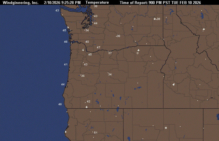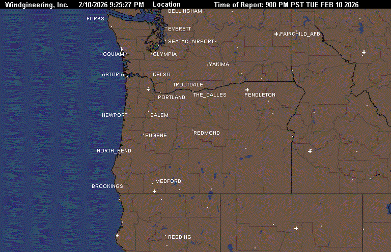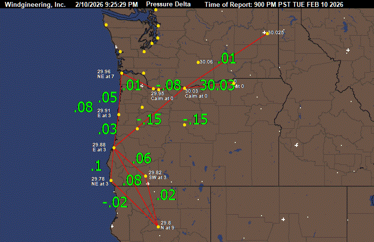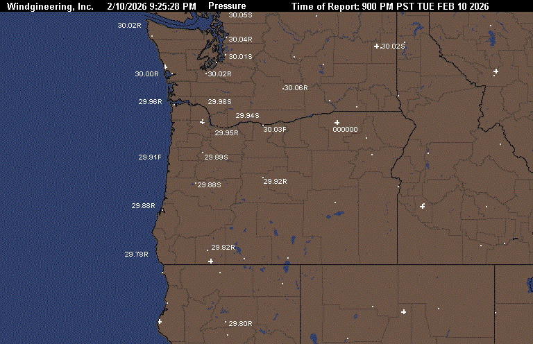 2/10/2026 3:58:26 PM2/10/2026 7:45:41 PMMinutes since image created 227FEB 10 2026 700 PM PSTGetWind(NE10)GetWind(NE3)GetWind(N8)GetWind(CALM)GetWind(CALM)GetWind(N5)GetWind(SE6)GetWind(E14)GetWind(CALM)GetWind(0)Image can only be created once every 10 minutes. Data updated each hour ASTORIA_Pressure 29.94ASTORIA_Wind NE at 10NEWPORT_Pressure 29.91NEWPORT_Wind NE at 3NORTH_BEND_Pressure 29.87NORTH_BEND_Wind N at 8BROOKINGS_Pressure 29.76BROOKINGS_Wind Calm at 0MEDFORD_Pressure 29.8MEDFORD_Wind Calm at 8REDDING_Pressure 29.77REDDING_Wind N at 5PORTLAND_Pressure 29.93PORTLAND_Wind SE at 6TROUTDALE_Pressure 29.93TROUTDALE_Wind E at 14THE_DALLES_Pressure 30.03THE_DALLES_Wind Calm at 0PENDLETON_Pressure 0PENDLETON_Wind at 0YAKIMA_Pressure 30.04FAIRCHILD_AFB_Pressure 0SPOKANE_GEIGER_Pressure 30.03SPOKANE_AVERAGE_Pressure 30.03ASTORIA_Pressure - NEWPORT_Pressure .03NEWPORT_Pressure - NORTH_BEND_Pressure .04NORTH_BEND_Pressure - BROOKINGS_Pressure .11NORTH_BEND_Pressure - MEDFORD_Pressure .07NORTH_BEND_Pressure - REDDING_Pressure .1ASTORIA_Pressure - PORTLAND_Pressure .01PORTLAND_Pressure - THE_DALLES_Pressure -.1THE_DALLES_Pressure - PENDLETON_Pressure 30.03NORTH_BEND_Pressure - SPOKANE_AVERAGE_Pressure -.16NORTH_BEND_Pressure - THE_DALLES_Pressure -.16THE_DALLES_Pressure - SPOKANE_AVERAGE_Pressure 0:ASTORIA CLEAR 49 40 71 NE10 29.94R 1:NEWPORT CLEAR 43 41 93 NE3 29.91R 2:PORTLAND PTCLDY 48 33 56 SE6 29.93R 3:VANCOUVER_WA PTCLDY 52 29 41 E8 29.94R 4:SCAPPOOSE PTCLDY 47 40 76 NW7 29.93R 5:HILLSBORO PTCLDY 49 40 71 NE7 29.92R 6:AURORA PTCLDY 47 34 60 N10 29.90R 7:MCMINNVILLE PTCLDY 47 36 65 N8 29.89R 8:SALEM PTCLDY 47 36 65 NW7 29.88R 9:CORVALLIS PTCLDY 41 40 96 W5 29.89R 10:EUGENE PTCLDY 39 38 96 NW6 29.87R 11:NORTH_BEND PTCLDY 46 40 79 N8 29.87R 12:BROOKINGS MOCLDY 47 43 86 CALM 29.76S 13:ROSEBURG CLOUDY 42 37 82 CALM 29.87R 14:SEXTON_SUMMIT MOCLDY 41 27 57 E5 29.78S 15:MEDFORD PTCLDY 44 38 79 CALM 29.80R 16:TROUTDALE PTCLDY 48 35 60 E14 29.93R 17:THE_DALLES PTCLDY 41 37 86 CALM 30.03R 18:REDMOND CLEAR 36 32 85 W8 29.91R 19:BEND CLEAR 37 28 70 W7 29.91R 20:KLAMATH_FALLS LGTRAIN 41 32 70 N12 29.82S 21:LAKEVIEW LGTRAIN 40 32 73 SW3 29.87R 22:HERMISTON MOCLDY 41 36 82 CALM 30.01R 23:PENDLETON NOT_AVBL 0 0 0 0 000000 24:MEACHAM NOT_AVBL 0 0 0 0 000000 25:LA_GRANDE PTCLDY 41 25 53 S14 29.99F 26:BAKER_CITY CLEAR 31 23 72 E8 30.00S 27:BURNS PTCLDY 31 25 78 E8 29.94R 28:ROME 00 42 23 46 E14 29.89S 29:ONTARIO CLEAR 37 27 67 N6 30.02R 30:VANCOUVER BC CLEAR 43 43 100 W9 30.05S 31:REDDING CLOUDY 53 47 79 N5 29.77R 32:EVERETT CLEAR 44 40 85 N7 30.02R TC 7 33:BOEING_FIELD CLEAR 48 40 73 VRB3 30.02R TC 9 34:RENTON CLEAR 48 40 73 NW6 30.01R TC 9 35:SEATAC_AIRPORT PTCLDY 45 40 82 N9 30.00R TC 7 36:JBLM_MCCHORD NOT_AVBL 0 0 0 0 000000 37:PUYALLUP CLEAR 39 39 100 CALM 29.99R TC 4 38:JBLM_FT_LEWIS NOT_AVBL 0 0 0 0 000000 39:TACOMA_NARROWS CLEAR 47 39 74 N16 29.99R TC 8 40:BELLINGHAM CLEAR 40 37 89 CALM 30.04R TC 4 41:FRIDAY_HARBOR CLEAR 45 39 79 VRB3 30.05S TC 7 42:EASTSOUND CLEAR 41 41 100 CALM 30.05F TC 5 43:PORT_ANGELES MOCLDY 38 37 97 CALM 30.06R TC 3 44:NAS_WHIDBEY CLEAR 44 41 89 NW8 30.04S TC 7 45:BURLINGTON CLEAR 46 46 100 N12 30.04R TC 8 46:SHELTON CLEAR 44 39 82 N6 29.97R TC 7 47:OLYMPIA FOG 37 37 100 CALM 29.99S VSB 1/4 TC 3 48:CHEHALIS CLEAR 45 45 100 N8 29.98S TC 7 49:KELSO PTCLDY 48 42 80 VRB3 29.97R TC 9 50:VANCOUVER PTCLDY 52 29 41 E8 29.94R TC 11 51:SCAPPOOSE_OR PTCLDY 47 40 76 NW7 29.93R TC 8 52:PORTLAND_OR PTCLDY 48 33 56 SE6 29.93R TC 9 53:FORKS CLEAR 44 40 85 N9 30.01S TC 7 54:HOQUIAM CLEAR 48 41 76 N3 29.99R TC 9 55:ASTORIA_OR CLEAR 49 40 71 NE10 29.94R TC 9 56:STAMPEDE_PASS CLEAR 28 28 100 CALM 29.98R TC -2 57:TROUTDALE_OR PTCLDY 48 35 60 E14 29.93R TC 9 58:THE_DALLES_OR PTCLDY 41 37 86 CALM 30.03R TC 5 59:OMAK PTCLDY 35 32 88 NW9 30.08S TC 2 60:WENATCHEE CLEAR 38 33 82 NW6 30.06S TC 3 61:ELLENSBURG CLEAR 32 30 92 N3 30.02S TC 0 62:YAKIMA CLEAR 37 31 78 CALM 30.04R TC 3 63:EPHRATA CLEAR 39 33 79 NW9 30.03R TC 4 64:MOSES_LAKE NOT_AVBL 0 0 0 0 000000 65:PASCO PTCLDY 39 35 86 N5 30.03S TC 4 66:HERMISTON_OR MOCLDY 41 36 82 CALM 30.01R TC 5 67:SPOKANE_GEIGER PTCLDY 41 28 60 E6 30.03S TC 5 68:SPOKANE_FELTS CLEAR 37 31 78 CALM 30.04S TC 3 69:FAIRCHILD_AFB NOT_AVBL 0 0 0 0 000000 70:COEURDALENE_ID CLEAR 34 31 88 NE6 30.05R TC 1 71:DEER_PARK CLEAR 32 28 85 NE6 30.04S TC 0 72:PULLMAN PTCLDY 36 31 82 E8 30.02S TC 2 73:LEWISTON_ID PTCLDY 40 33 76 S7 30.02S TC 4 74:WALLA_WALLA PTCLDY 41 37 86 CALM 30.00R TC 5 75:PENDLETON_OR NOT_AVBL 0 0 0 0 000000 76:MEDFORD PTCLDY 44 38 79 CALM 29.80R 77:KLAMATH_FALLS LGTRAIN 41 32 70 N12 29.82S 78:NORTH_BEND PTCLDY 46 40 79 N8 29.87R 79:ROSEBURG CLOUDY 42 37 82 CALM 29.87R 80:SEXTON_SUMMIT MOCLDY 41 27 57 E5 29.78S 81:BROOKINGS MOCLDY 47 43 86 CALM 29.76S 82:REDDING CLOUDY 53 47 79 N5 29.77R